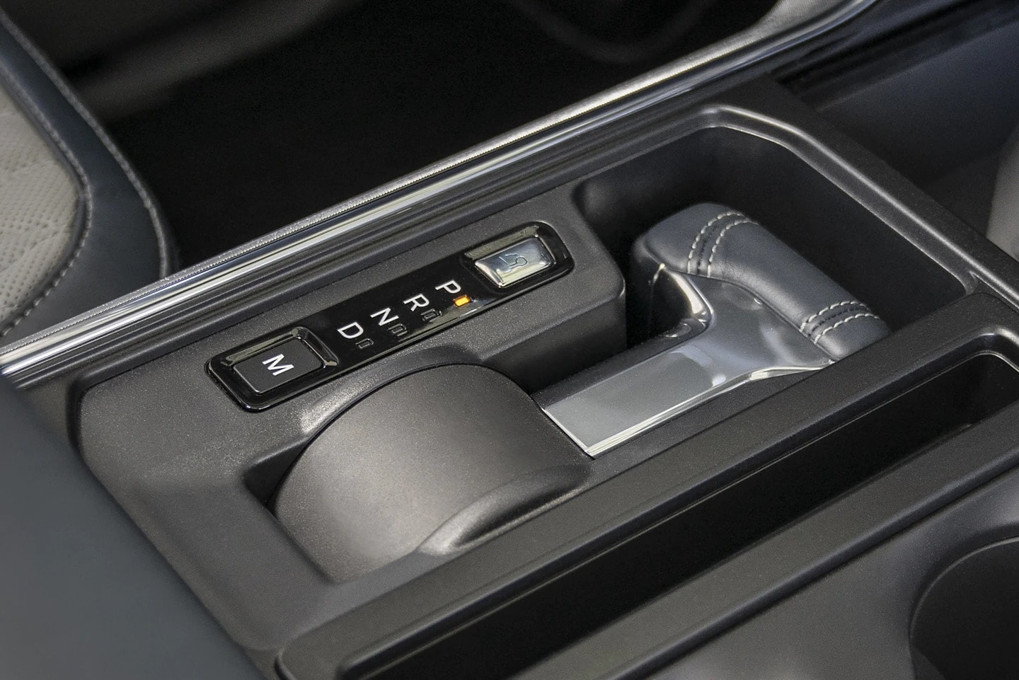 With the push of a button, the gear selector stows away to reveal a flat work surface to fold out. When parked, the available Stowable Shifter lays flat so you can open the available work surface.
